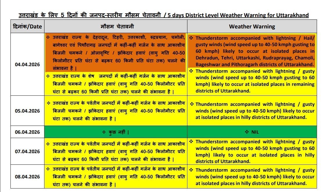 मौसम विभाग के मुताबिक 4 अप्रैल को देहरादून, टिहरी, उत्तरकाशी, रुद्रप्रयाग, चमोली, बागेश्वर और पिथौरागढ़ जिलों में कहीं-कहीं गरज के साथ आकाशीय बिजली चमकने, ओलावृष्टि और 40 से 50 किमी प्रति घंटा की रफ्तार से चलने वाली हवाएं 60 किमी प्रति घंटा तक पहुंचने की संभावना है। शेष जिलों में भी गरज-चमक और तेज हवाओं का असर देखने को मिल सकता है।